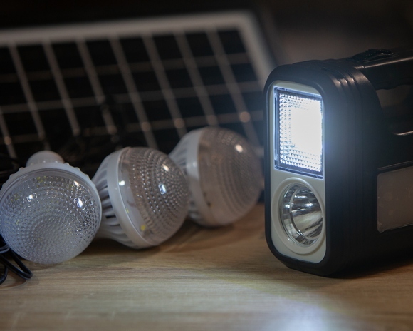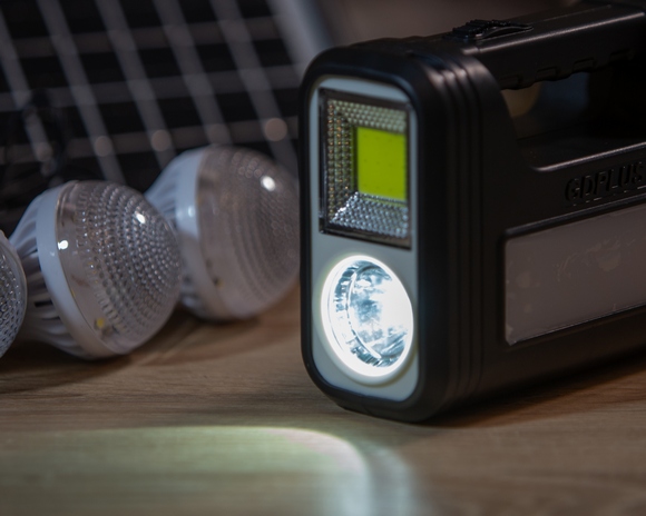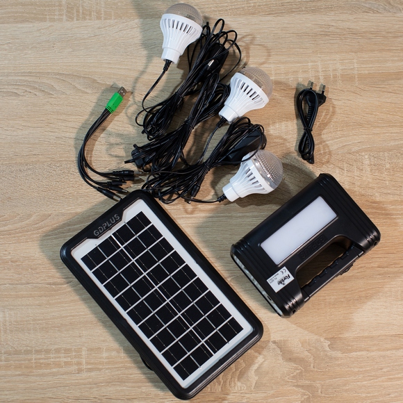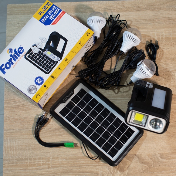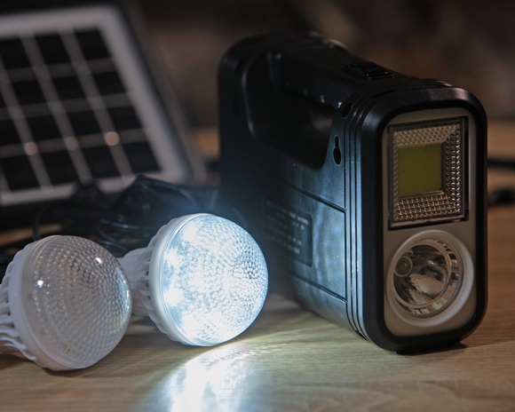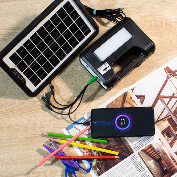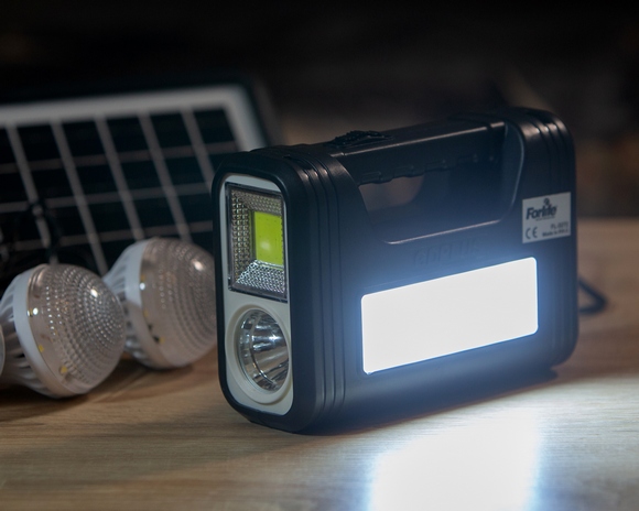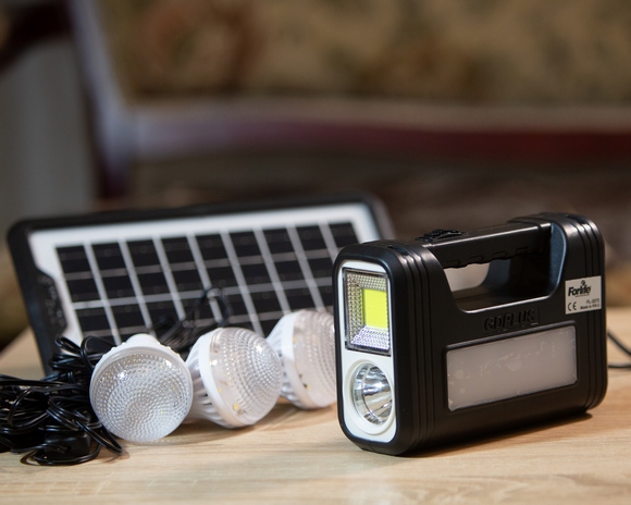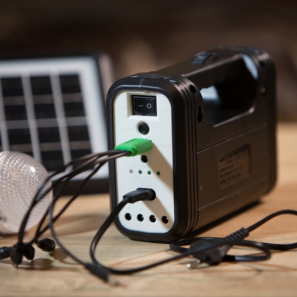 Портативна універсальна сонячна система обладнана літієвим акумулятором ємністю 8 Вт, з можливістю підзарядки від мережі 220В або від сонячної панелі.